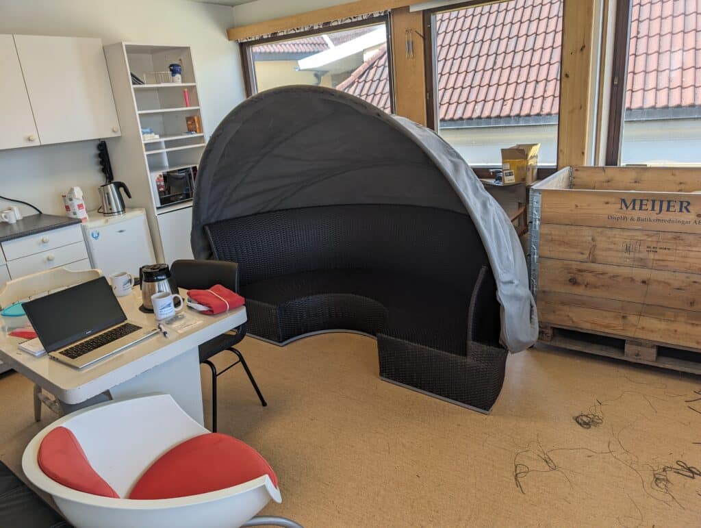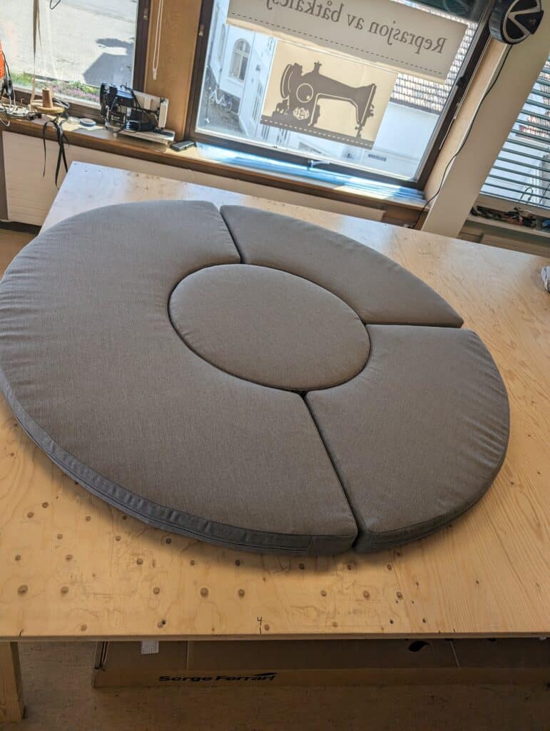 Her ble alle puter i den svensk bygde seilbåten renovert med nytt skum på 35 kg og ull stoff. Vi brukte 35 kg skumplast her pga de fleste putene vil bli brukt som seng for overnatting.