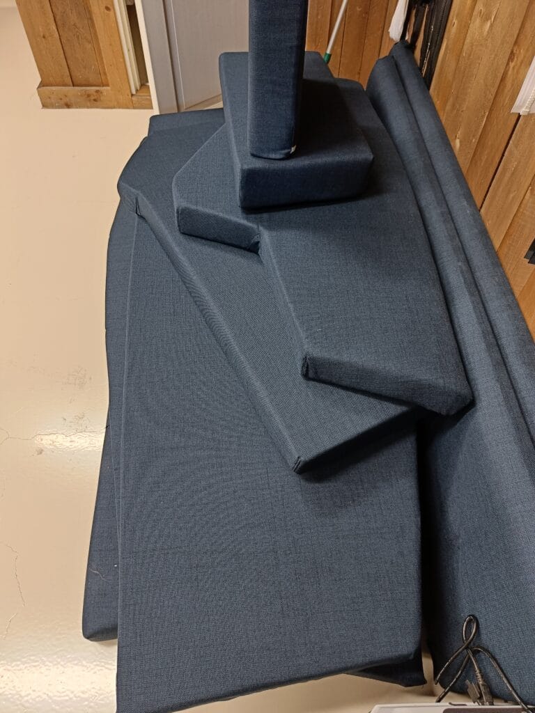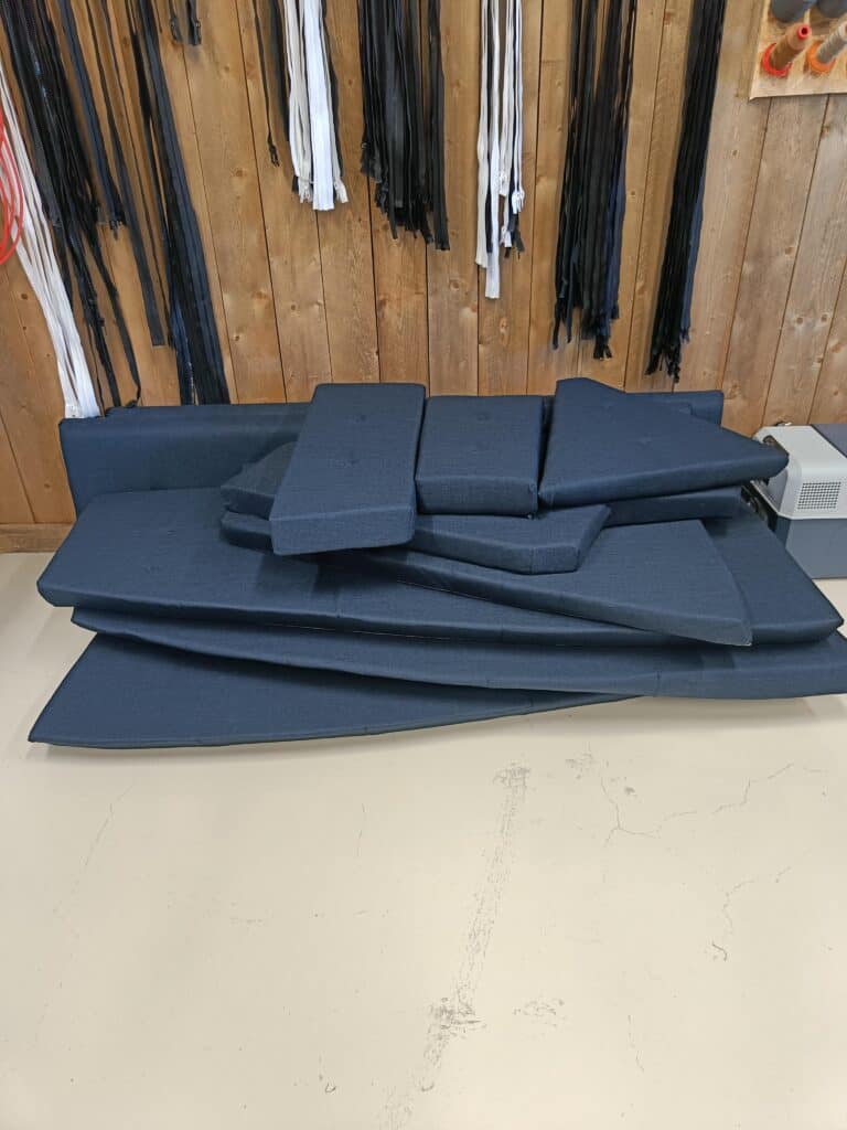 Her ble alle puter i den svensk bygde seilbåten renovert med nytt skum på 35 kg og ull stoff. Vi brukte 35 kg skumplast her pga de fleste putene vil bli brukt som seng for overnatting.