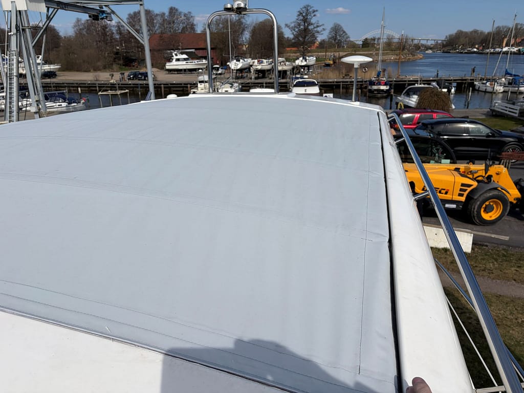 Ny kalesje til en Trawler laget i Sunbrella plus. Målet med denne var å få tilpasset kalesjen så bra at all vinduer skulle bli helt stramme og lett å se ut av. Men dette ble en stor jobb å tilpasse da båten er håndlaget og veldig mye fasong i både takrekker og håndrekker.