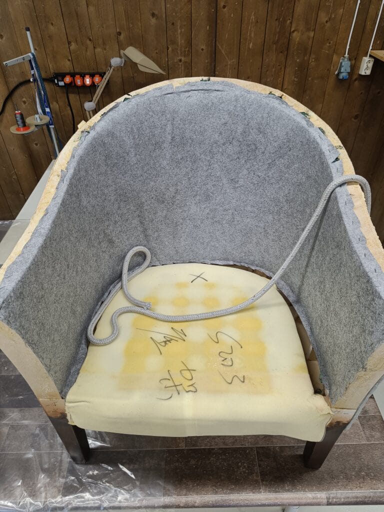 Oppussing av gammel stol i høy kvalitet. Her brukte vi 53 kg skumplast og norskproduser ullstoff.