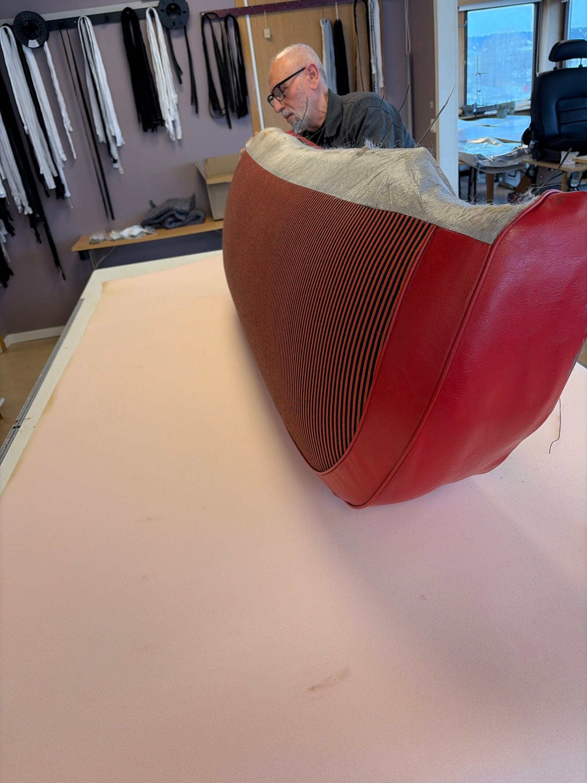 Her bygger Abdul opp skumplasten til ryggen på en hjørnesofa.