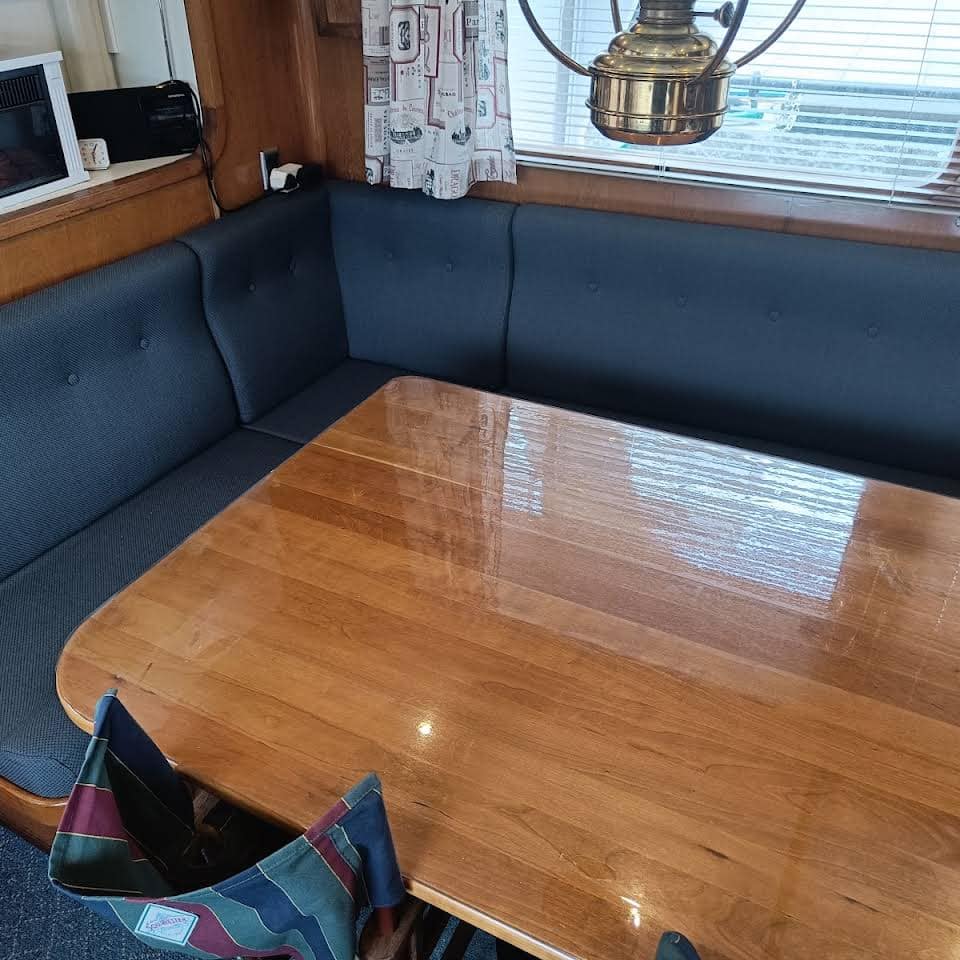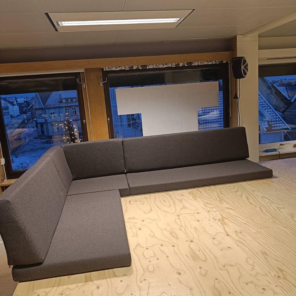 Ny Hjørnesofa til en Trawler laget med 53 g skumplst og norskprodusert 100% ullstoff. Fantastisk kvalitet både i bruk og utseende.